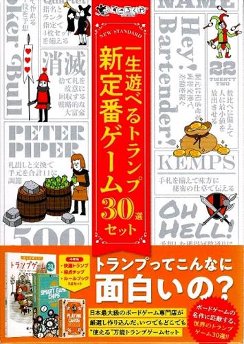 トランプ、得点を記録するチップ、30種のルールが収録されたわかりやすい書籍と、トランプゲームに必要なものがすべてひとつの箱に収まった万能セットです。