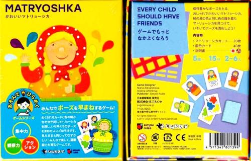 【商品説明】『かわいいマトリョーシカ』は、場に並んだ、さまざまな色の服を着たマトリョーシカのイラストから、毎回カードで指示される3色の組み合わせの服を着た1人を急いで探し、その人がしているポーズをいち早く真似することで、その回の3色カードをごほうびとして集めるカードゲームです。