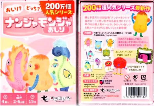 【商品説明】『ナンジャモンジャ おしり』は、カードに描かれた謎生物ナンジャモンジャ族に、その人のセンスで名前を付けてみんなで覚え、以降、同じナンジャモンジャ族が現れたらその名前をいち早く叫ぶゲーム『ナンジャモンジャ』に、もしナンジャモンジャ族が「おしり」をこちらに向けた姿で現れたら、名前に加えて「○○のおしり!」と呼ばねばならない「おしり」ルールが追加されたゲームです。